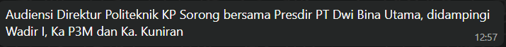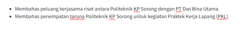 - Membahas peluang kerjasama riset antara Politeknik KP Sorong dengan PT Dwi Bina Utama.